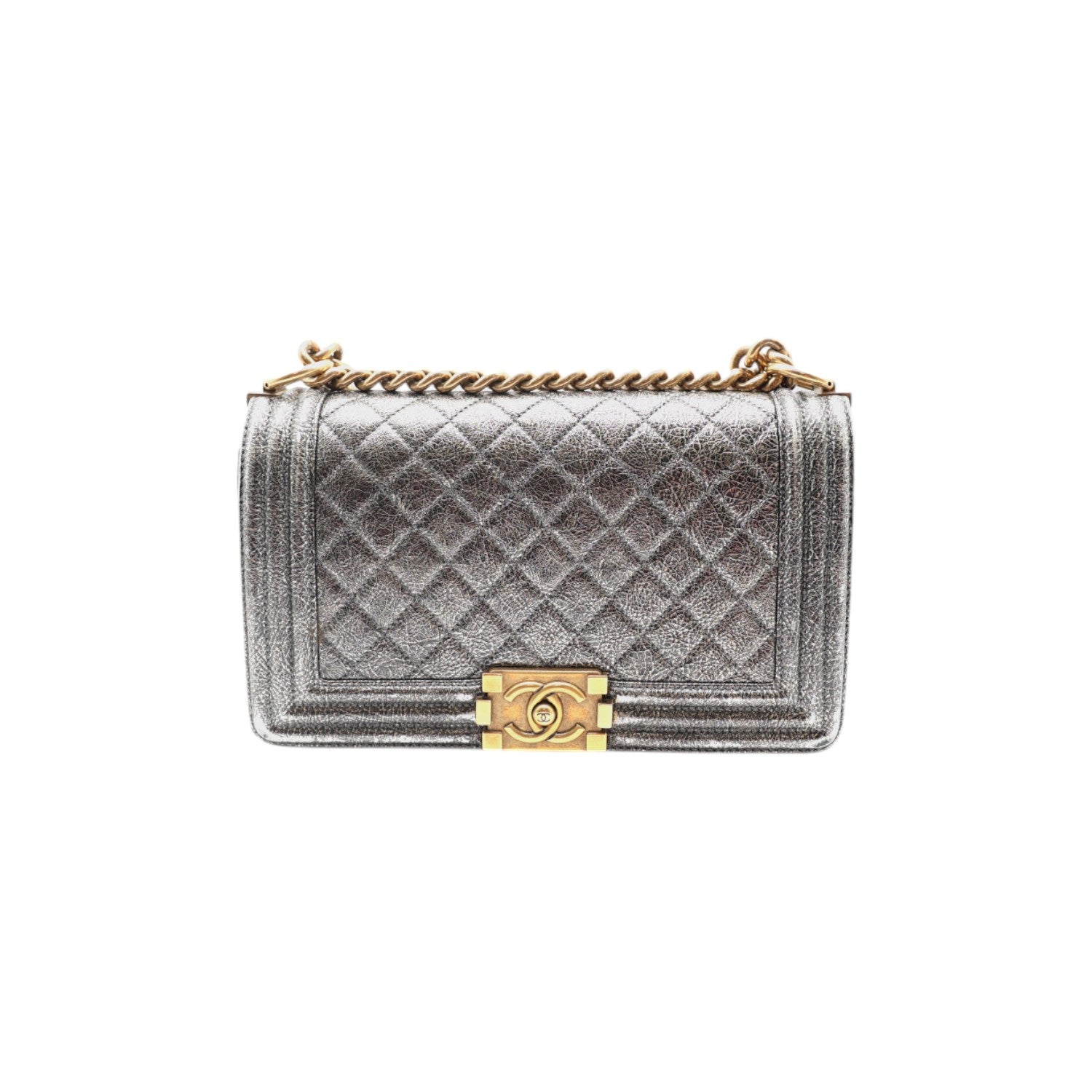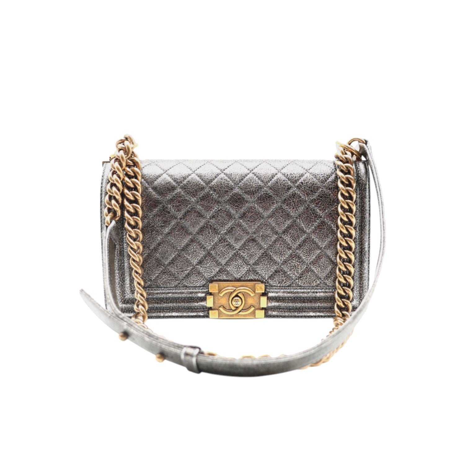 CHANEL Boy Medium Calfskin Metallic Silver With Gold Hardware And Chain Strap
