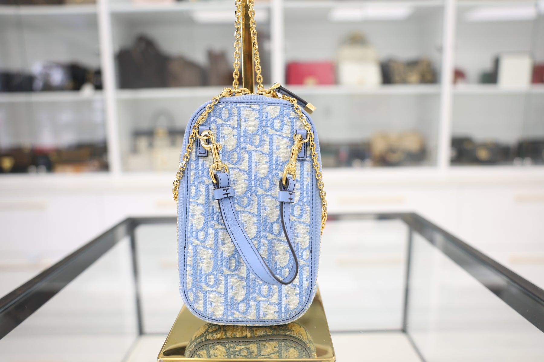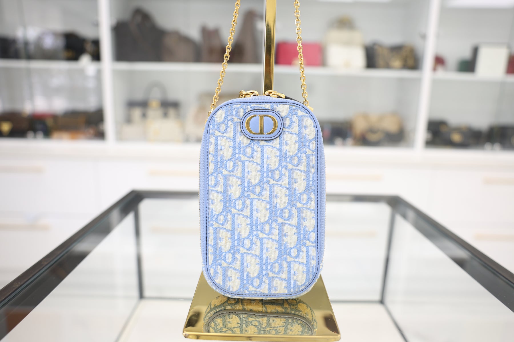 Elevate your everyday essentials with this iconic Christian Dior 30 Montaigne phone holder, crafted from the house's signature blue Oblique jacquard canvas. Featuring the instantly recognizable diagonal monogram pattern that defines Dior's aesthetic, this compact accessory combines luxury with practicality. The structured silhouette and refined construction ensure your device stays secure while maintaining the sophisticated style Dior is renowned for. A timeless piece that seamlessly transitions from desk to travel, embodying the brand's commitment to elegant functionality.