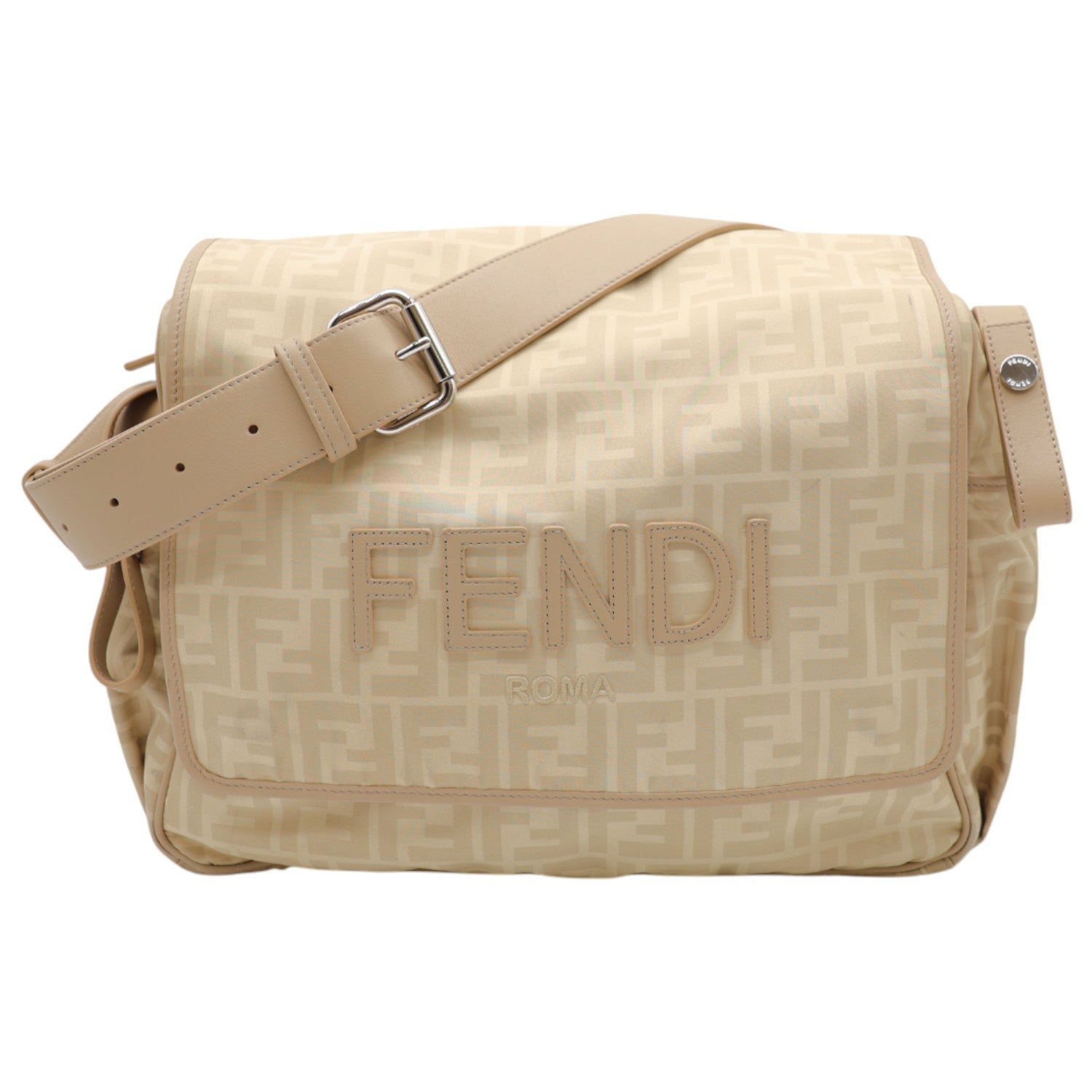 The Fendi FF-Pattern Print Nylon Baby Changing Bag In Beige is a stylish and practical choice for parents. This bag features a distinctive FF-pattern print, adding a touch of elegance to your essentials. Made from durable nylon, it ensures longevity and ease of use. The beige color complements various outfits, making it a versatile addition to your baby gear. Perfect for on-the-go changes, this bag combines functionality with a chic design.