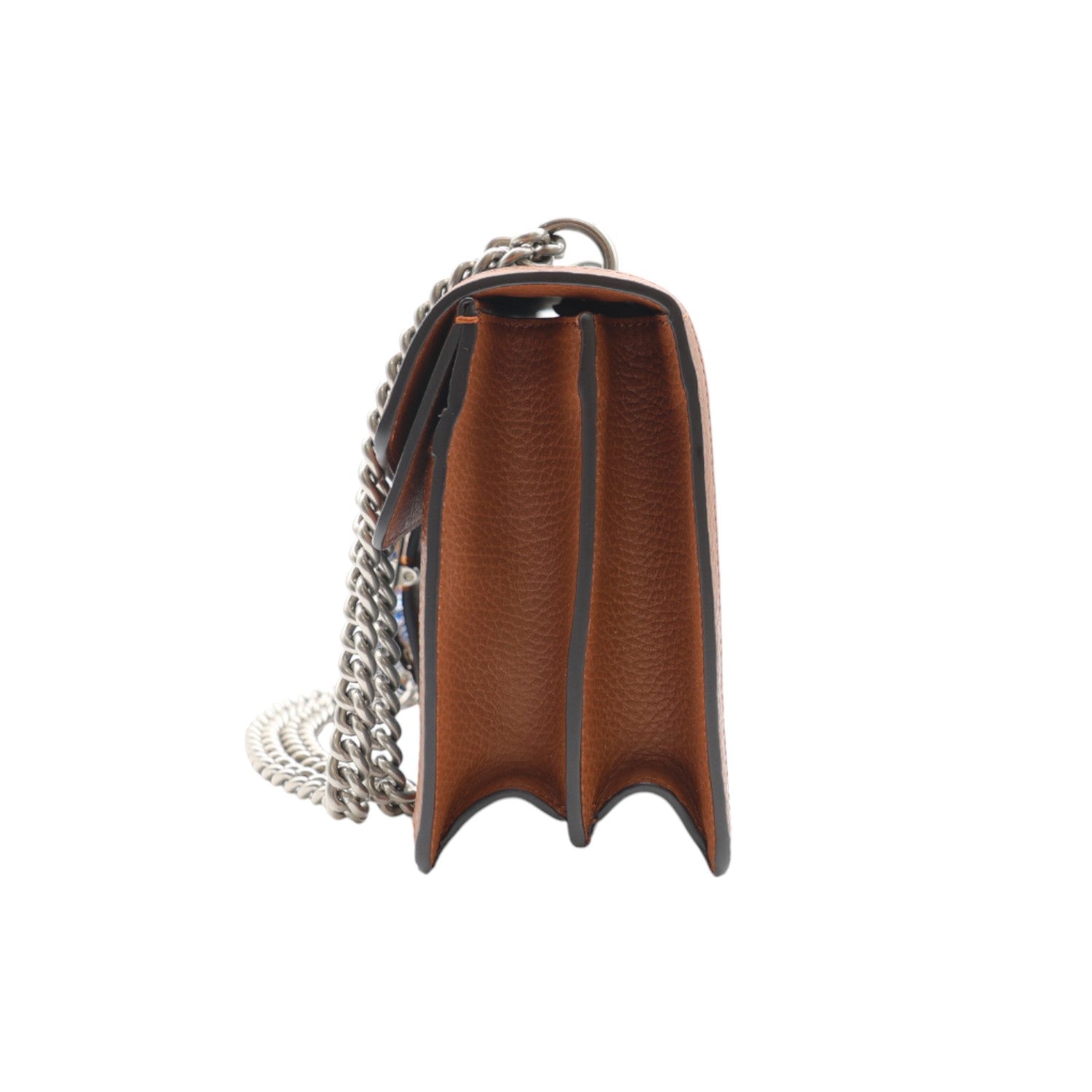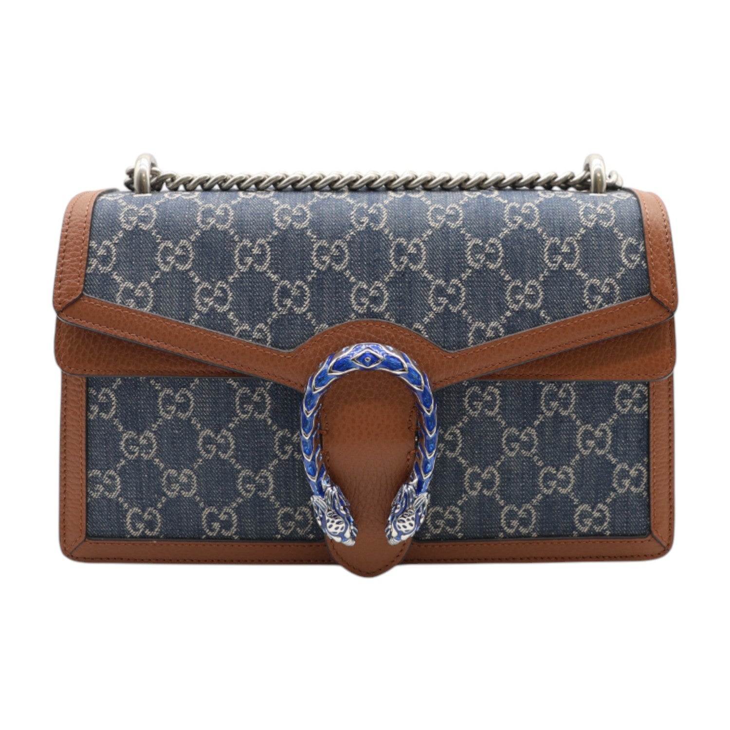 The Gucci Dionysus Small Shoulder Bag is a stylish accessory in Blue GG Denim. It features a distinctive Brown Leather Trim, adding a touch of elegance. This bag is perfect for those who appreciate both fashion and functionality. The combination of denim and leather creates a unique look that stands out.