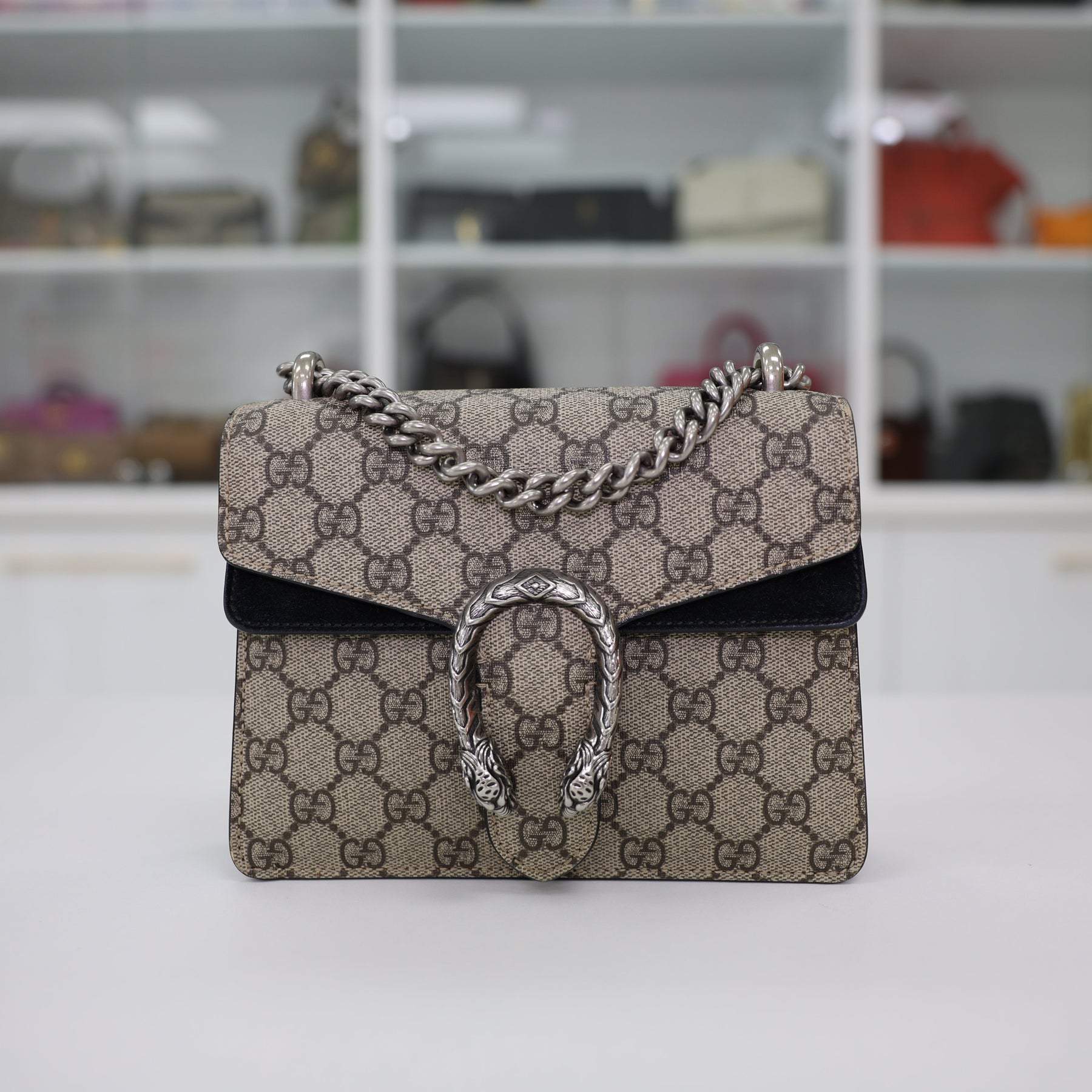The Gucci Dionysus Small GG Supreme Canvas Shoulder Bag In Taupe is a chic accessory. It boasts a taupe hue and is made from canvas material. The bag showcases a GG Supreme design, adding a touch of elegance. Perfect for essentials, this shoulder bag is ideal for daily use. The small size ensures it's manageable and versatile.
