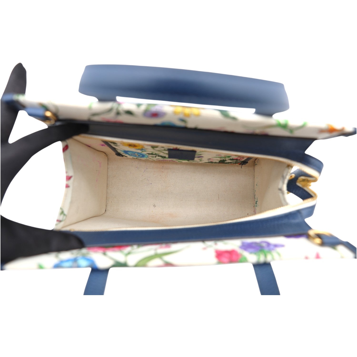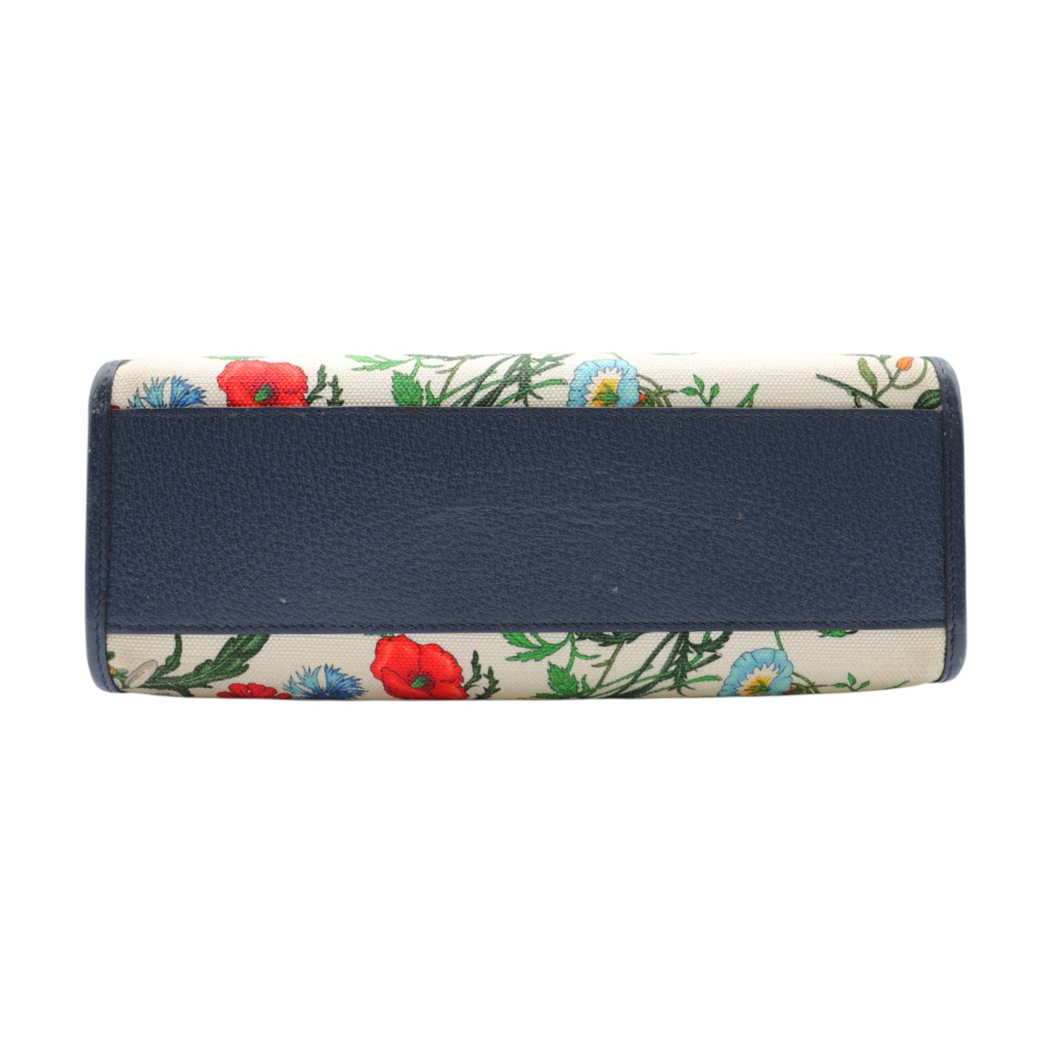 The Gucci Flora Medium Canvas Tote Bag features a stylish canvas construction. This tote bag is perfect for everyday use, combining functionality with a chic design. It is made from canvas with blue navy leather trim, adding a touch of sophistication.