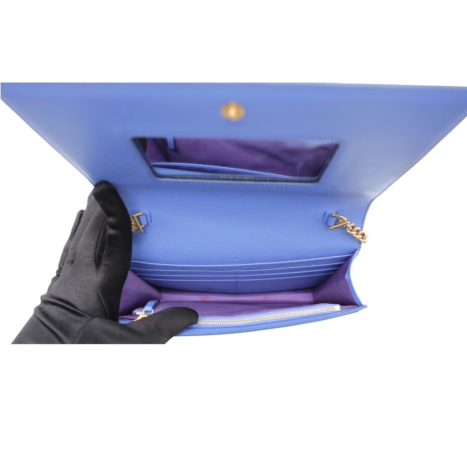 The Gucci GG Marmont Wallet On Chain Crossbody Bag in Blue Lilach is a versatile accessory. It combines functionality with style, making it perfect for various occasions.