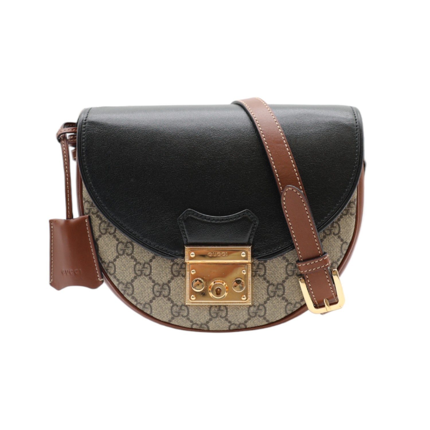 Practicality Meets Fashion With its practical size, this bag is perfect for essentials. The crossbody style ensures hands-free convenience. Stay stylish and organized with the Gucci GG Supreme Padlock Saddle Crossbody Bag.