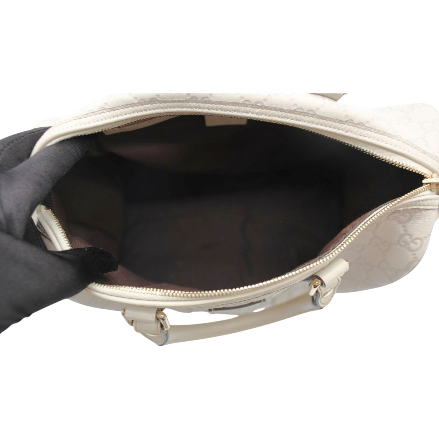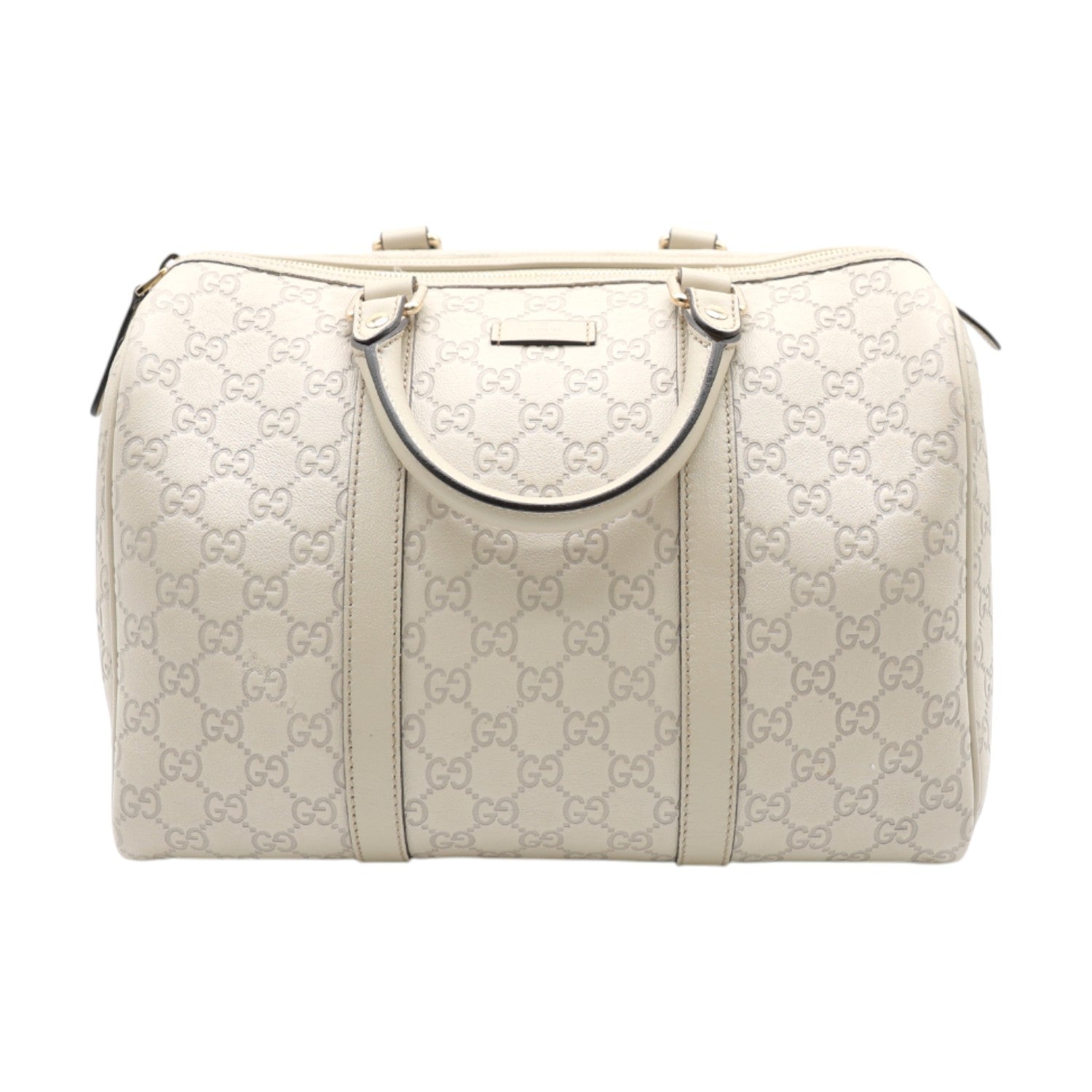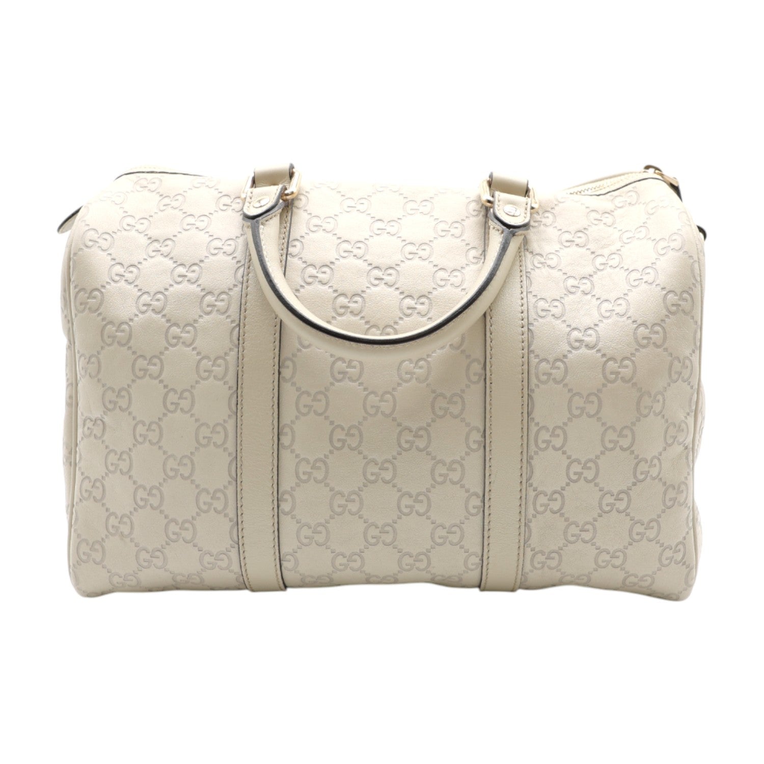 The Gucci Guccissima Joy Boston Leather Handbag in Ivory is a stylish accessory. It features a classic Guccissima design. The handbag is crafted from leather. It comes in a neutral ivory color. Perfect for versatile use, it pairs well with various outfits. The Boston style offers a chic, modern look.