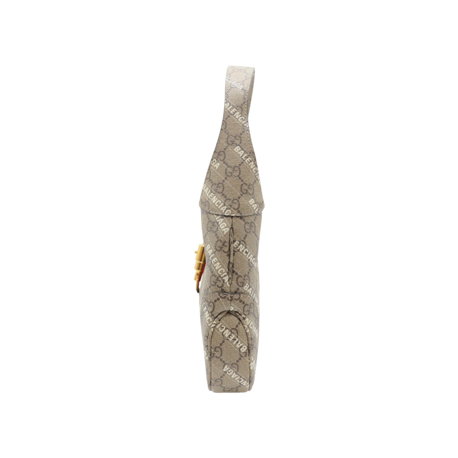 The image showcases the bag's distinctive design and shape. It highlights the collaboration between Gucci and Balenciaga. The bag appears to be a statement piece, ideal for fashion-forward individuals.