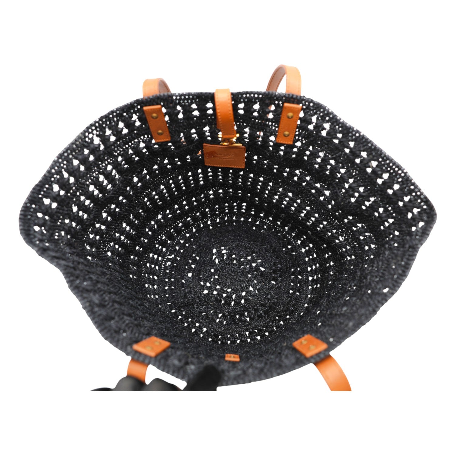 The image shows the tote bag in black raffia. It has a medium size and a sleek design. The raffia material is visible, adding texture. The black color is prominent, highlighting its versatility. The bag appears to be a practical choice for daily use.