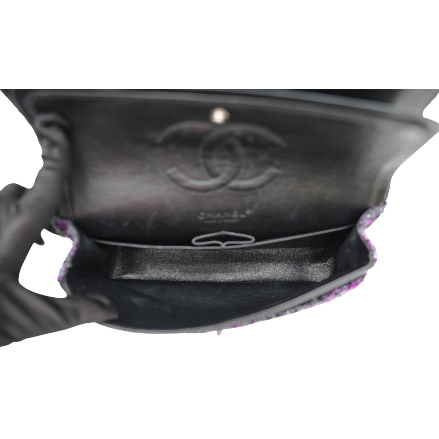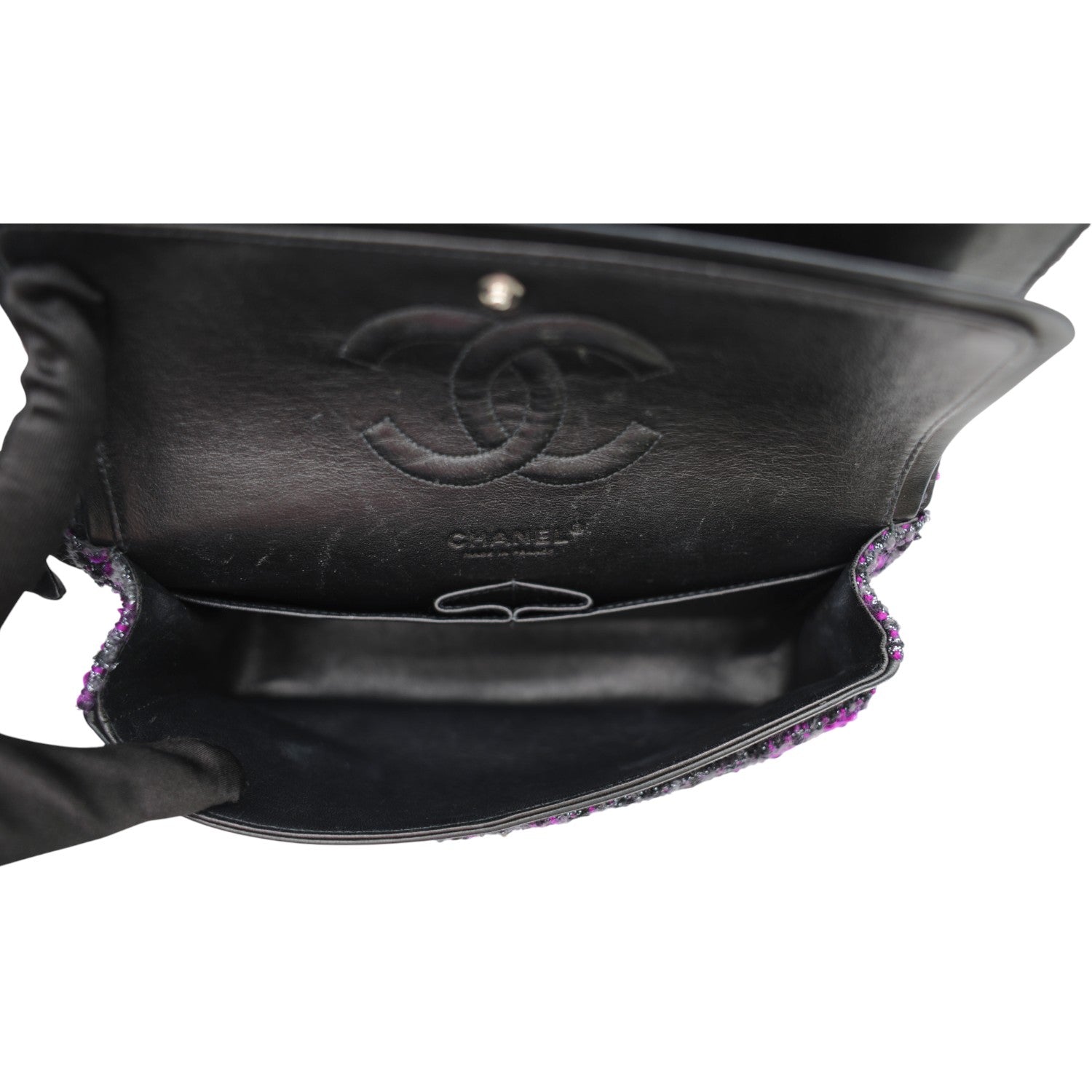 This shoulder bag is versatile and can be used for various occasions. Whether for work, casual outings, or special events, it complements any outfit. The CHANEL Medium Double Flap Tweed Shoulder Bag In Purple is a must-have accessory.