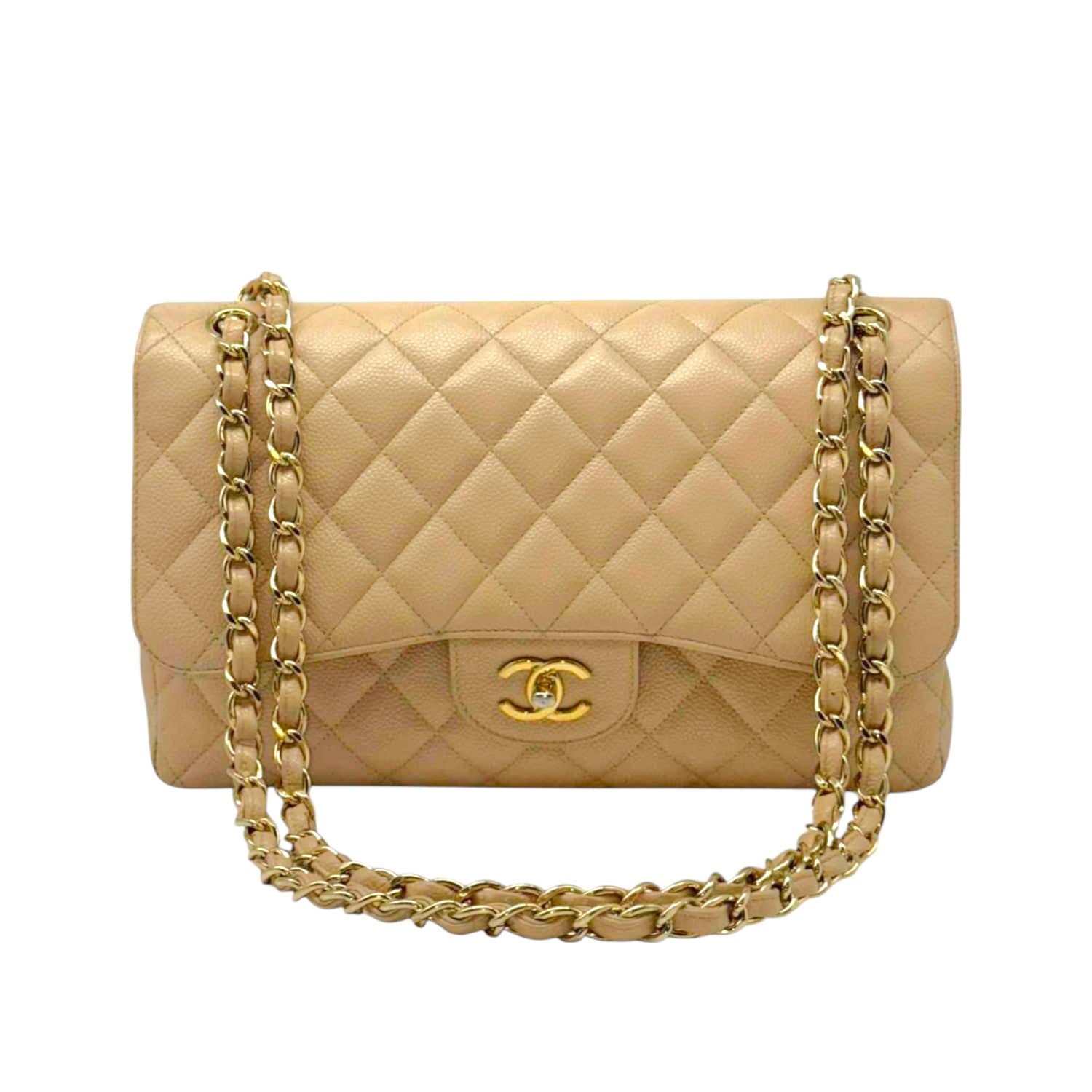 CHANEL Double Flap Jumbo Caviar Leather In Beige With Gold Chain Strap